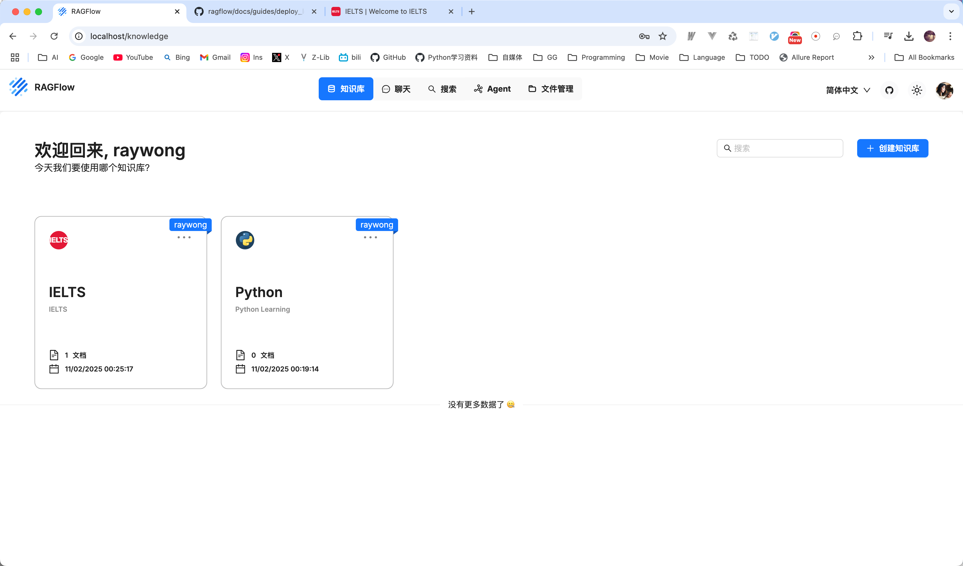 浏览器中访问localhost:80即可看到RAGflow的界面,如下图:
